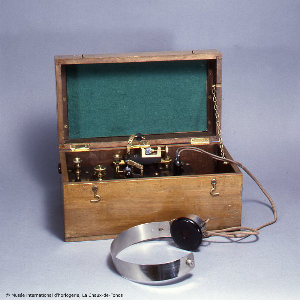Disposé dans un coffret en bois, l’appareil récepteur à galène permet la réception d’ondes radio. Il fonctionne au moyen d’un détecteur formé d’un cristal anisotrope de galène (sulfure de plomb) sur lequel vient s’appuyer une pointe flexible, permettant de conduire le courant électrique. Un écouteur téléphonique y est relié pour la réception du signal sonore. Disposé au premier étage de l’Ecole d’horlogerie, l’appareil était relié à une antenne, un simple fil électrique tendu entre la coupole et le clocheton de l’Ecole d’horlogerie de La Chaux-de-Fonds.