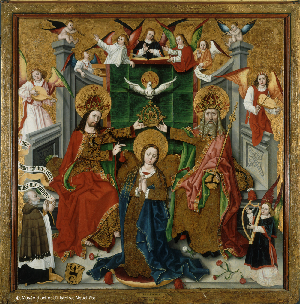 Le blason au bas du tableau est attribué à Jaques Valois, chapelain et chantre du chapitre de Notre Dame de Neuchâtel à la fin du XVe siècle, ce qui laisse supposer que l’œuvre a été exécutée pour la Collégiale de Neuchâtel. Pour la protéger de la vague iconoclaste à la Réforme en 1530, le panneau du Couronnement aurait été caché au Landeron, resté catholique. L’œuvre s’inscrit dans la tradition artistique gothique mais les deux angelots sur les piliers semblent préfigurer les putti décoratifs de la Renaissance. L’œuvre a longtemps été attribuée au Maître à l’Oeillet mais les récentes recherches ont mis en évidence qu’il s’agirait plutôt d’un ensemble de Maîtres à l’œillet, appellation qui désigne divers artistes anonymes ayant peint, dans les ateliers de Berne, Fribourg, Zürich ou Baden, un ensemble de retables exécutés entre 1470 et le début du XVIe siècle. Ces œuvres sans signatures portent néanmoins des signes distinctifs : deux œillets – un rouge et un blanc – un seul œillet rouge, ou encore un œillet croisé avec un brin de lavande – comme pour le Couronnement de la Vierge. Une autre interprétation récente attribue l’œuvre à Thüring Meyerhofer, peintre actif à Baden entre 1484 et 1505.