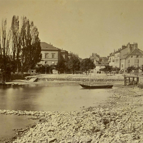 Le photographe s’est placé sur le quai oriental du port, embrassant presque l’ensemble du bassin. Toute la partie sud du port est déjà asséchée, empêchant les bateaux d’accoster à cet endroit. Sur la droite, le long de l’avenue du Premier Mars, quelques badauds observent la scène. Au fond, un petit débarcadère en bois est désormais inutile. Derrière les peupliers du môle de la Guillotine se dresse la silhouette du Collège Latin.