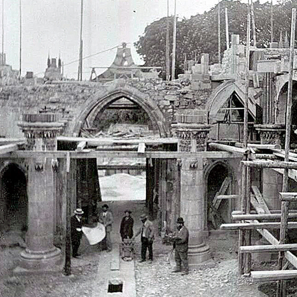 Soutenus par des échafaudages, les premiers murs de l’église s’élèvent, dessinant déjà la nef et les bas-côtés. Près de l’entrée, Guillaume Ritter donne aux ouvriers ses consignes en s’aidant d’un plan. Le matériau de construction choisi est la pierre artificielle teintée en rouge pour imiter le grès d’Alsace, pays d’origine de Ritter et d’une partie des paroissiens, ce qui explique l’appellation familière « d’Eglise-Rouge » pour désigner le bâtiment. Les éléments ornementaux (chapiteaux, colonnes, décorations des arcades, tablettes, ornementations) sont ainsi fabriqués et moulés sur place.