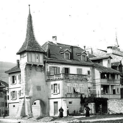 Cette photographie, réalisée par Paul Monnerat au début du 20e siècle, montre la maison des capucins, prise depuis l’entrée sud du bourg. Deux capucins et deux jeunes hommes posent devant la maison flanquée de la tour appelée la « portette ». Les capucins portent la bure brune à capuche serrée à la taille par une corde blanche qui les caractérise.